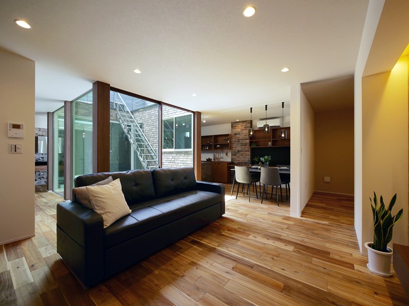 中庭を間取りの中心に配置し、室内に光があふれる住まいです。中庭とバルコニーをつなぐ階段が一体感を持たせ、遊び心があふれる空間を演出しています。一方で、プライバシーを守り、防犯性にも配慮しました。