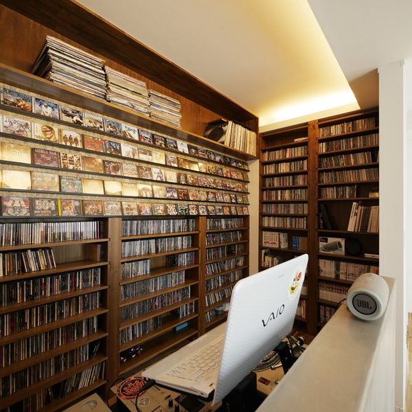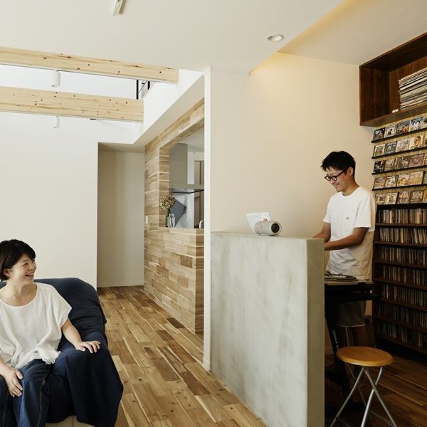 - 1 階はオープンな空間とし、中央にご主人のDJ ブースを配置。音楽を楽しみながらくつろげる空間とした。