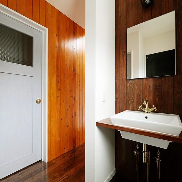 - キッチン背面のレンガを模したモルタル造形や、建具、取っ手、洗面器具など、随所にこだわりと心地よさを融合したデザインを散りばめることで、時を経てさらに愛着がわく家となるように計画。