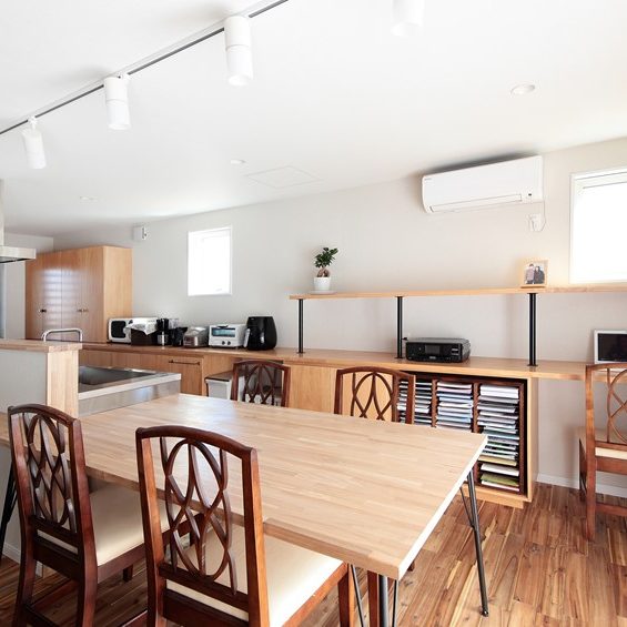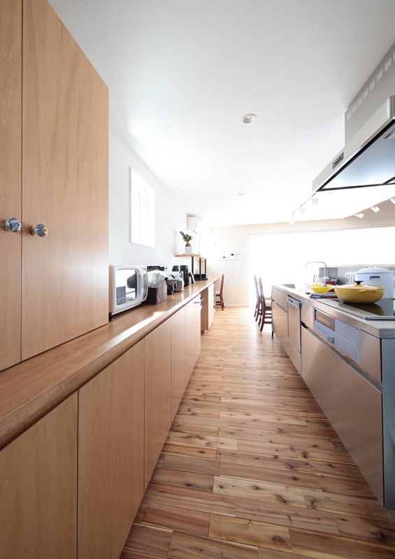 - キッチンのバックヤードには、並列されたダイニングまで続く7mもの収納付カウンターを設置。家事の効率を高めると共に、書斎スペースを確保した。