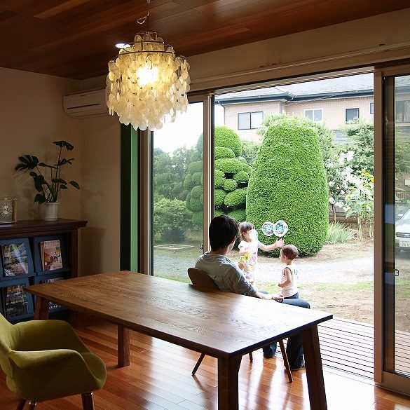 - ダイニングキッチンとリビング+和室を、L型に合わせて各々別の空間ブロックとした。これにより、つながりがありながらも、活気の違う空間を演出。
