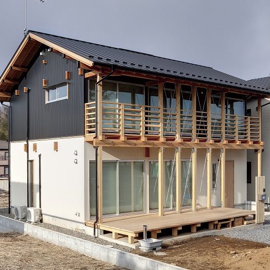 - 大きな開口部を設けるためにバルコニー部にブレース金物補強。これも外観デザインの一つとして取り入れる。