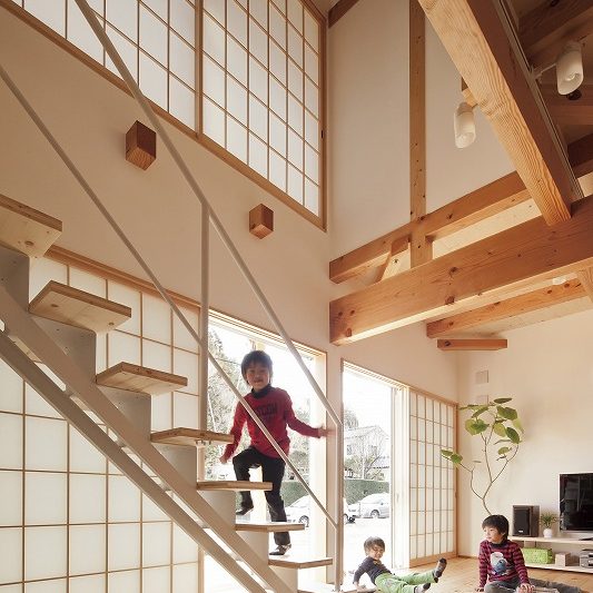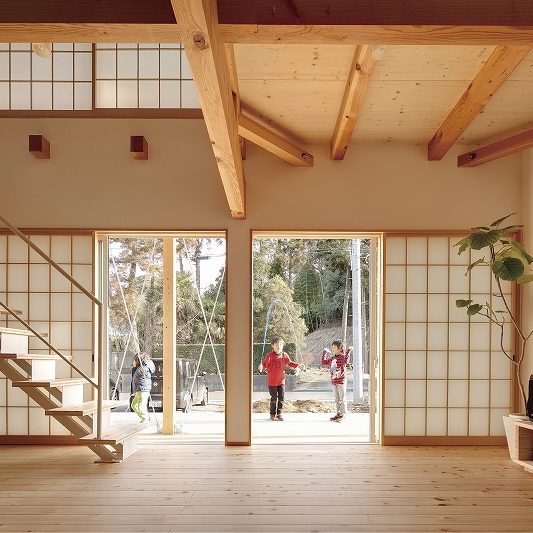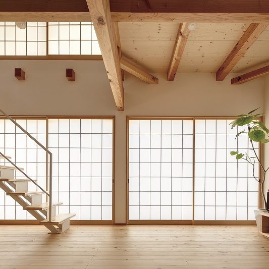 - 大きな窓に大きな障子。昼は穏やかな日差しを取り込み、夜は家全体が美しい灯りのように。