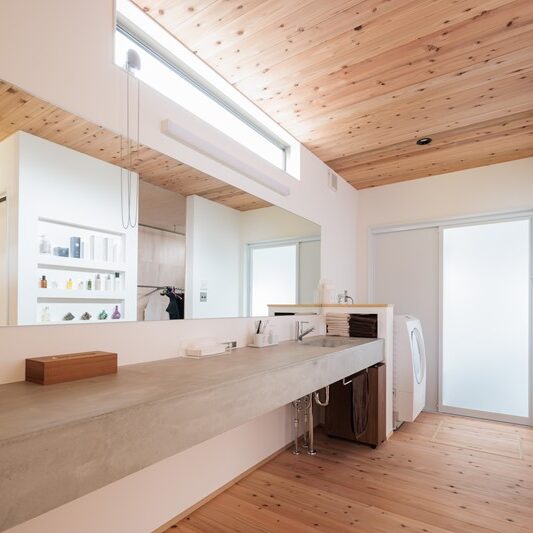 - 洗う⇒干す⇒収納という流れを一室で完結できる合理性と、モルタル造作洗面、ニッチなどの演出による情緒性の組み合わせで、日常を豊かな気持ちでストレスなく過ごせる空間に。
