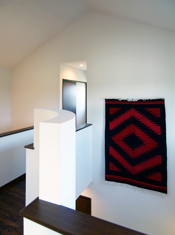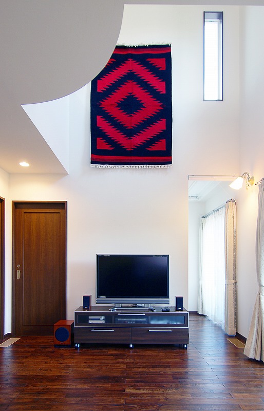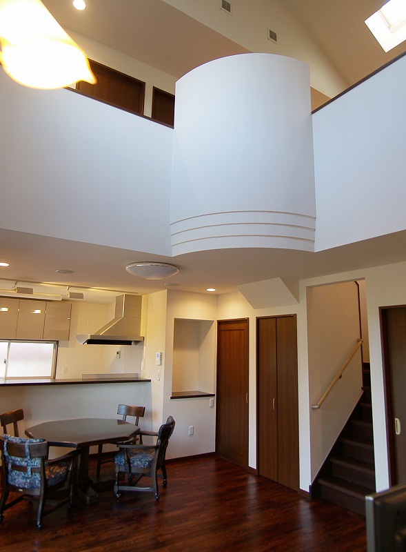 • リビングの吹き抜け空間にアール造形のアクセント。全室にアンティーク調の無垢の床材を使用した。